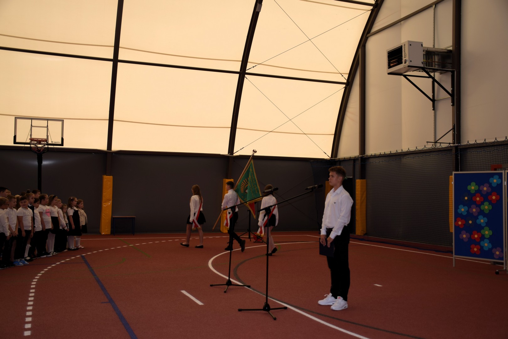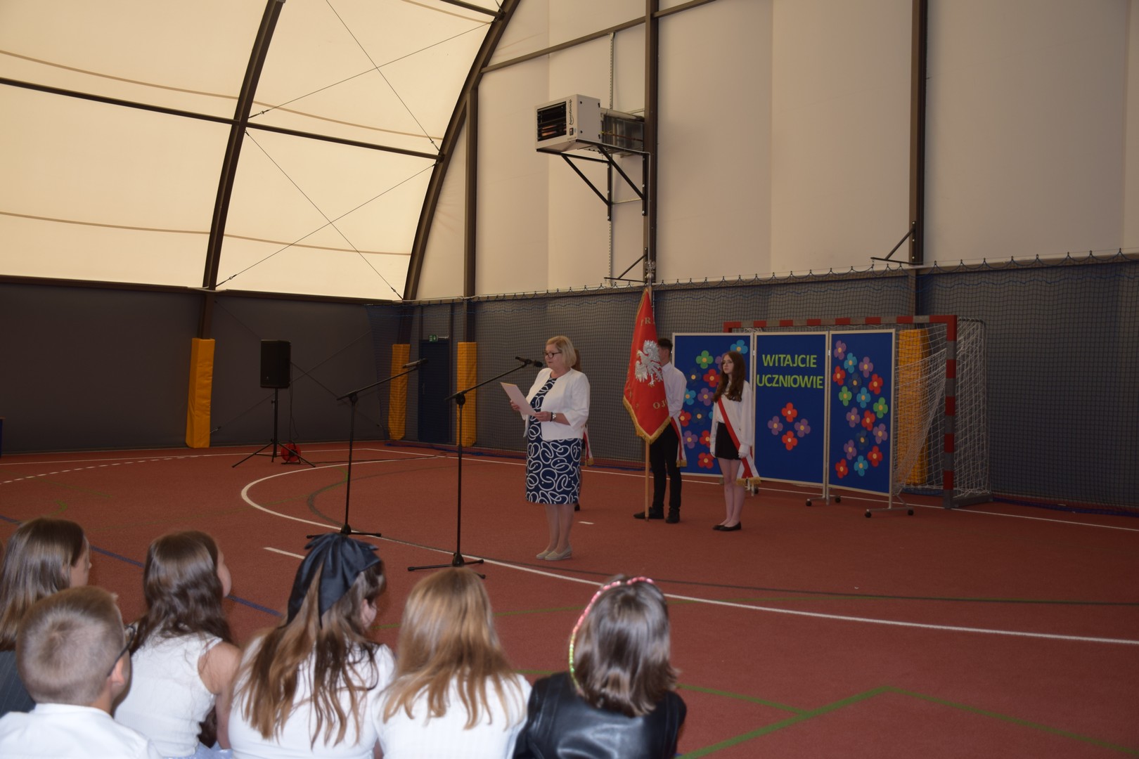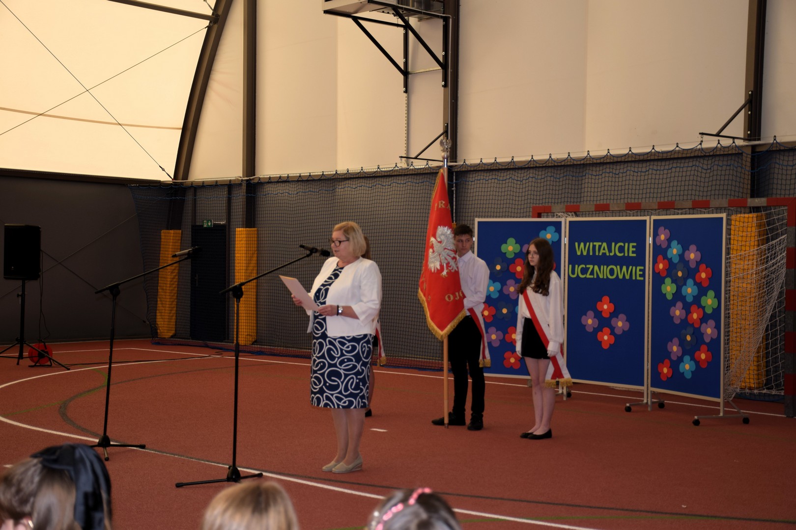 Uroczystość rozpoczęła się od wprowadzenia pocztu sztandarowego i odśpiewania hymnu narodowego. Następnie głos zabrała Pani Dyrektor, która serdecznie powitała całą społeczność szkolną, a szczególnie uczniów klas pierwszych rozpoczynających swoją szkolną przygodę. W swoim przemówieniu podkreśliła znaczenie współpracy, wzajemnego szacunku oraz wytrwałości w zdobywaniu wiedzy.