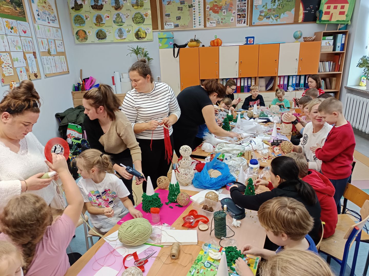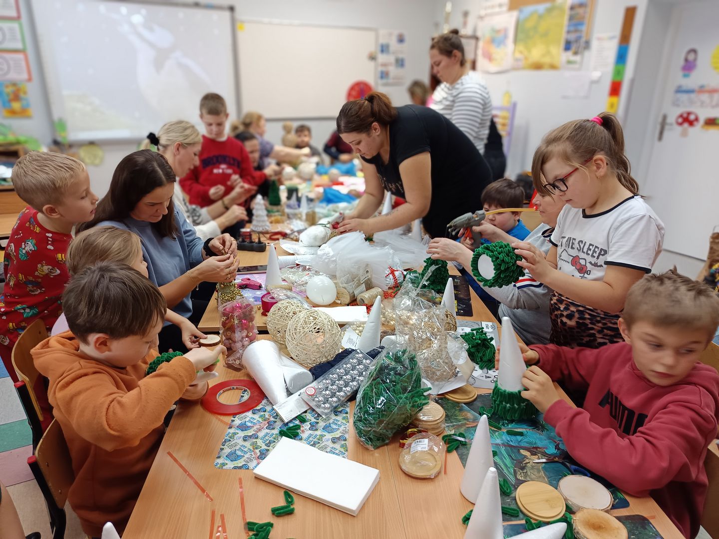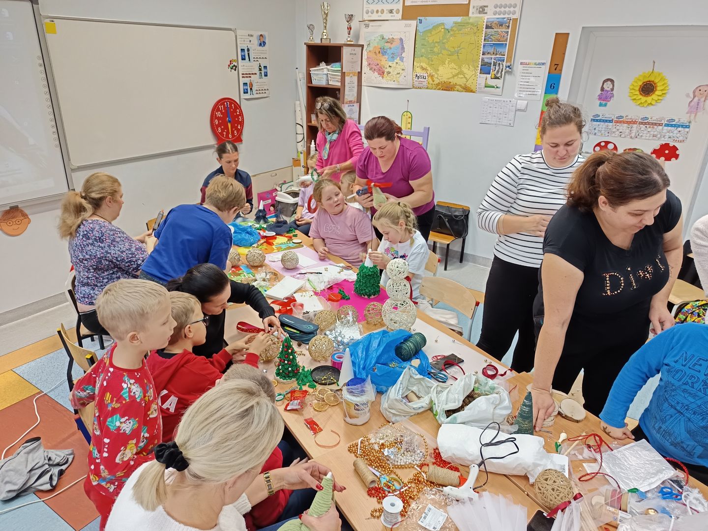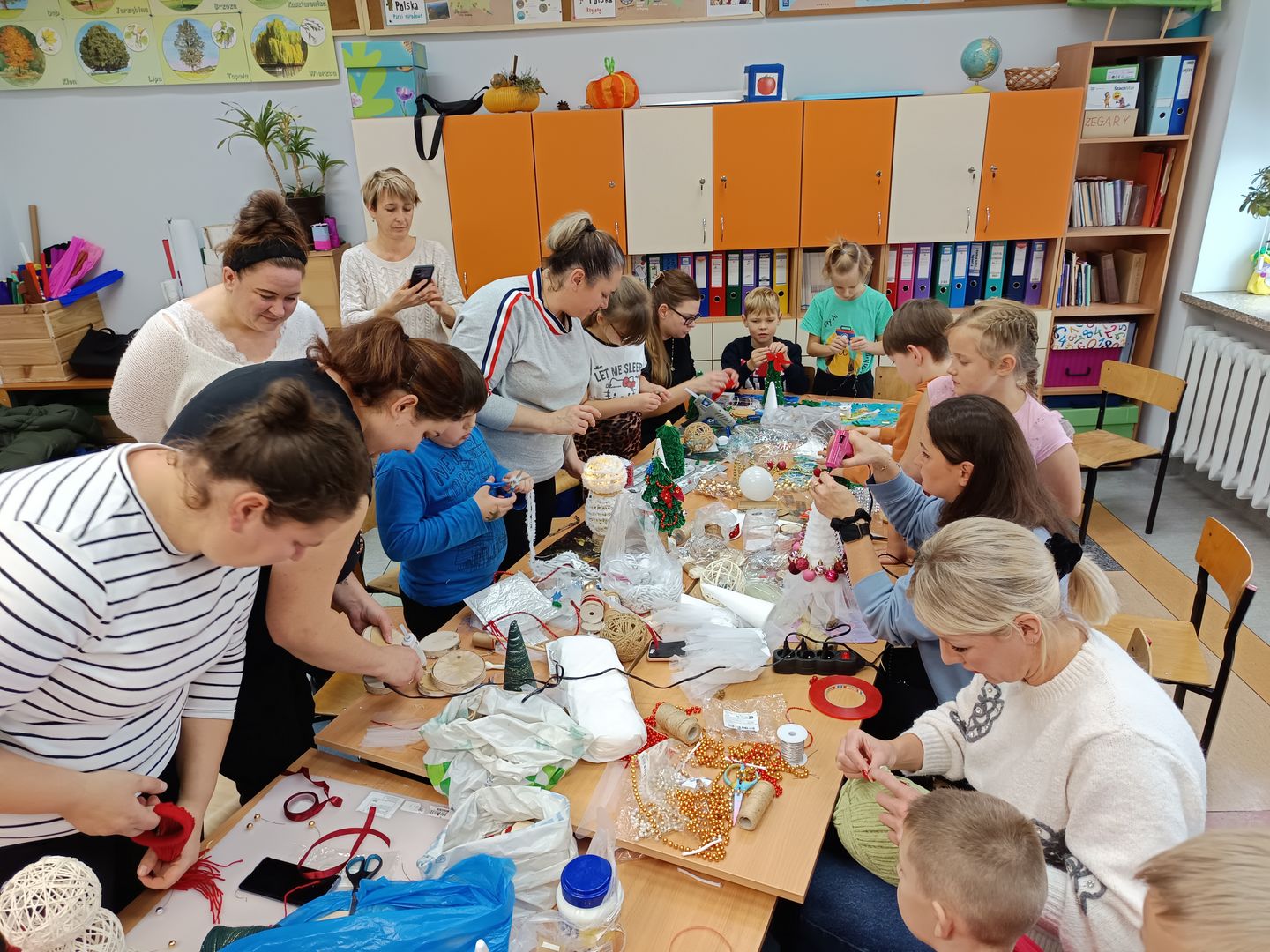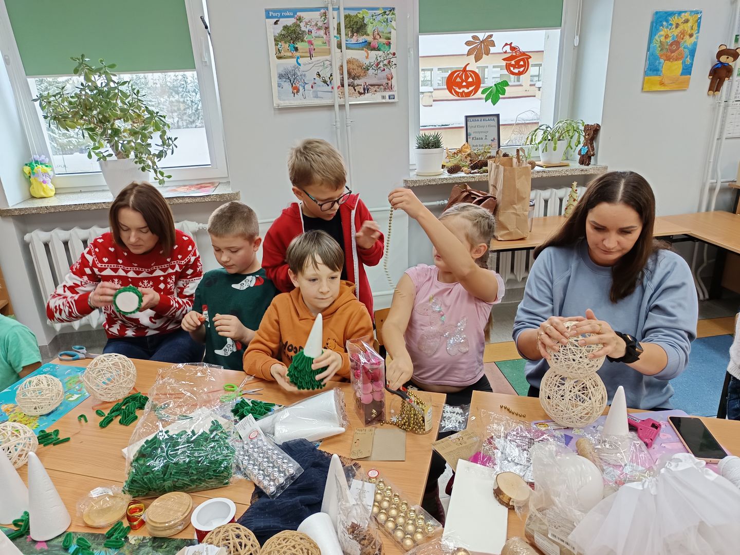 Na spotkanie przybyły mamy ponad połowy uczniów, które wspólnie z dziećmi tworzyły piękne i pomysłowe ozdoby bożonarodzeniowe. Atmosfera była naprawdę wspaniała – dzieci i mamy zaangażowane w pracę, a kreatywność nie miała granic.