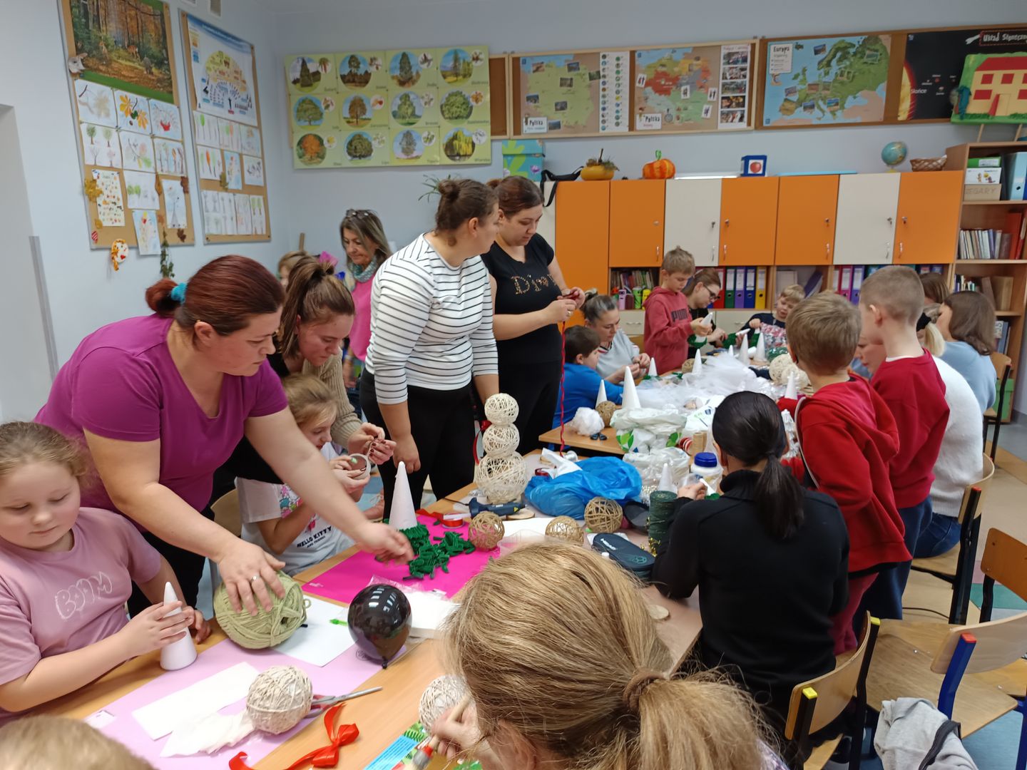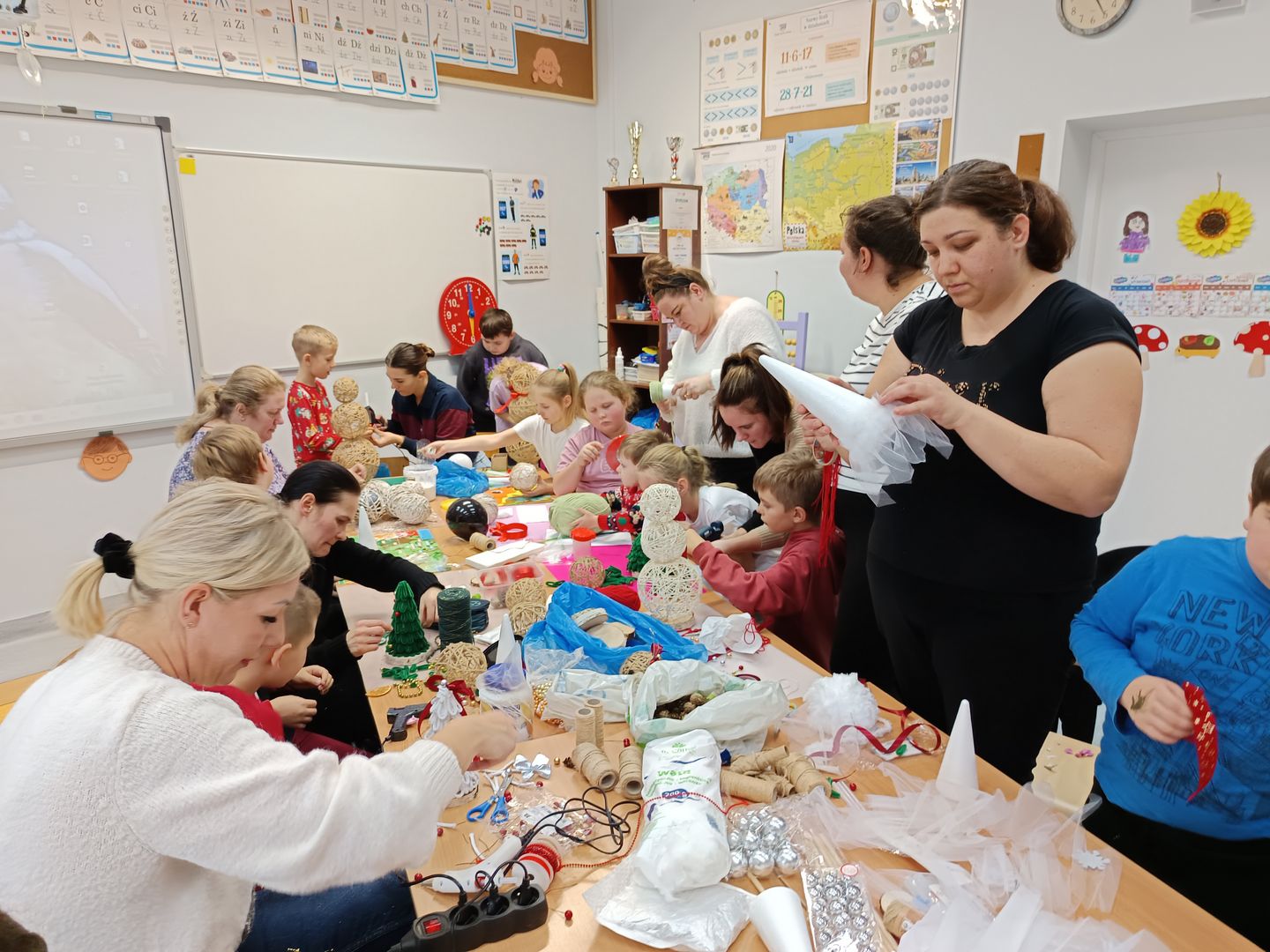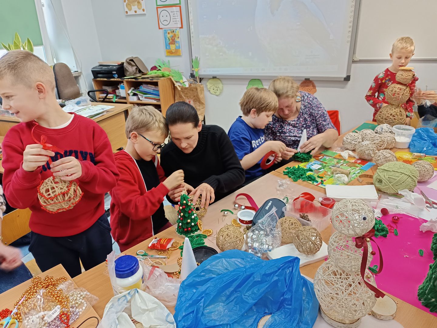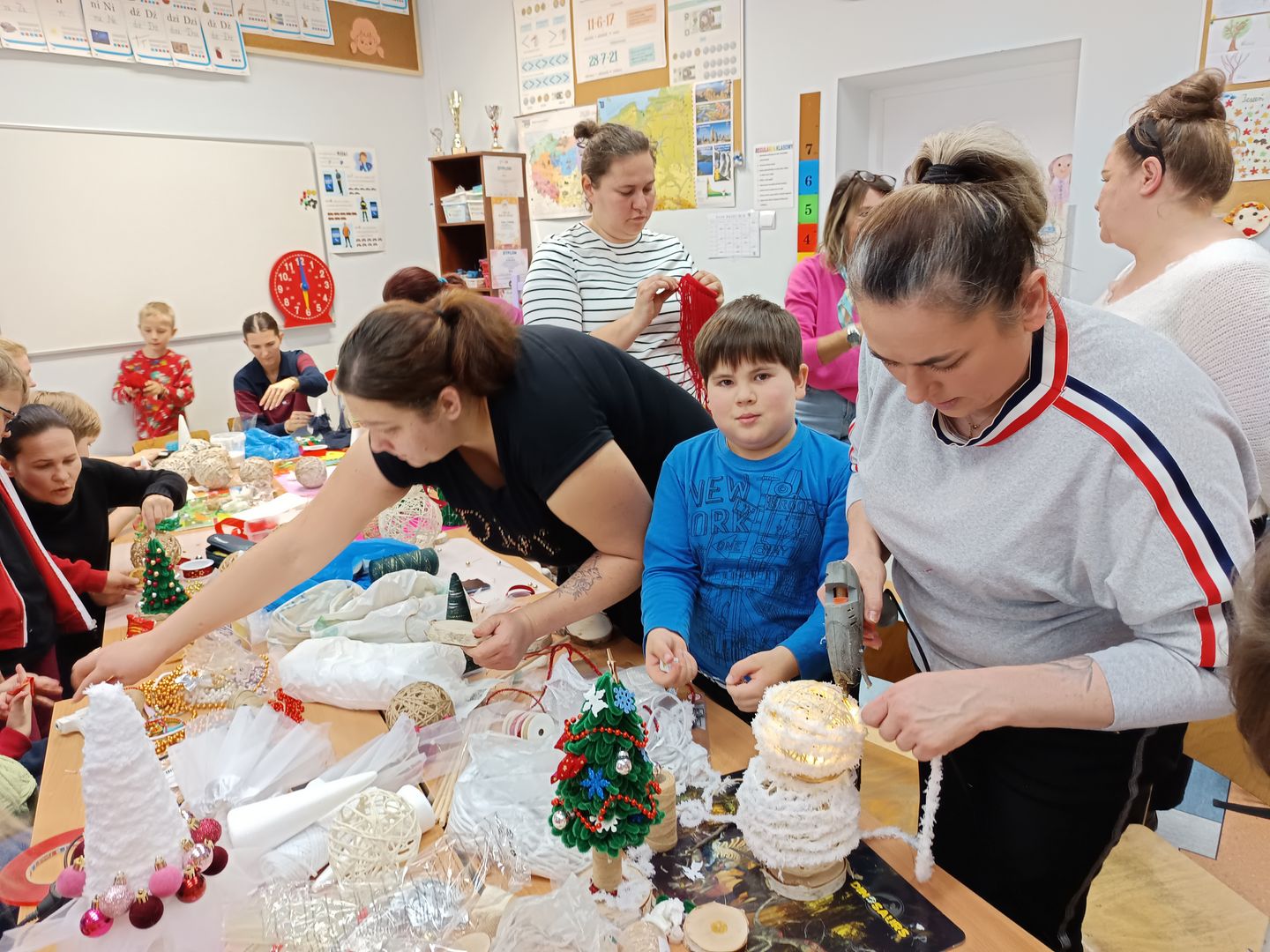 Na spotkanie przybyły mamy ponad połowy uczniów, które wspólnie z dziećmi tworzyły piękne i pomysłowe ozdoby bożonarodzeniowe. Atmosfera była naprawdę wspaniała – dzieci i mamy zaangażowane w pracę, a kreatywność nie miała granic.
