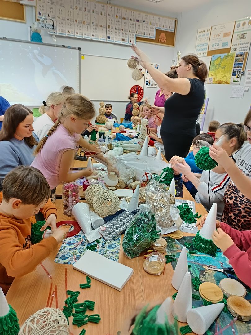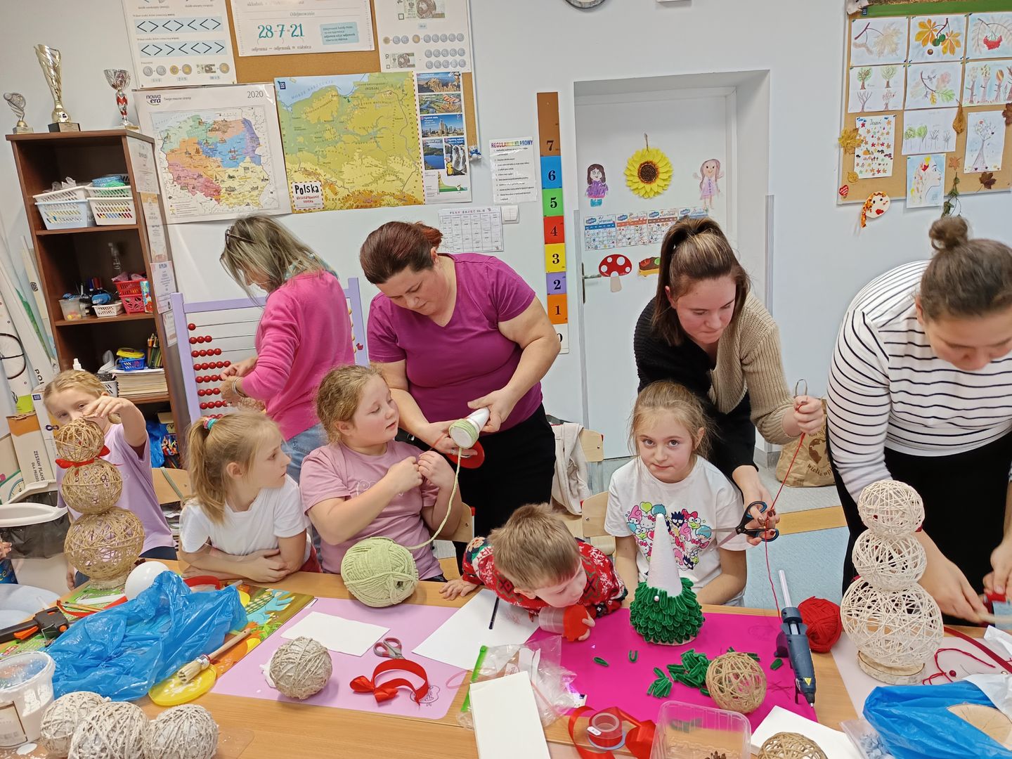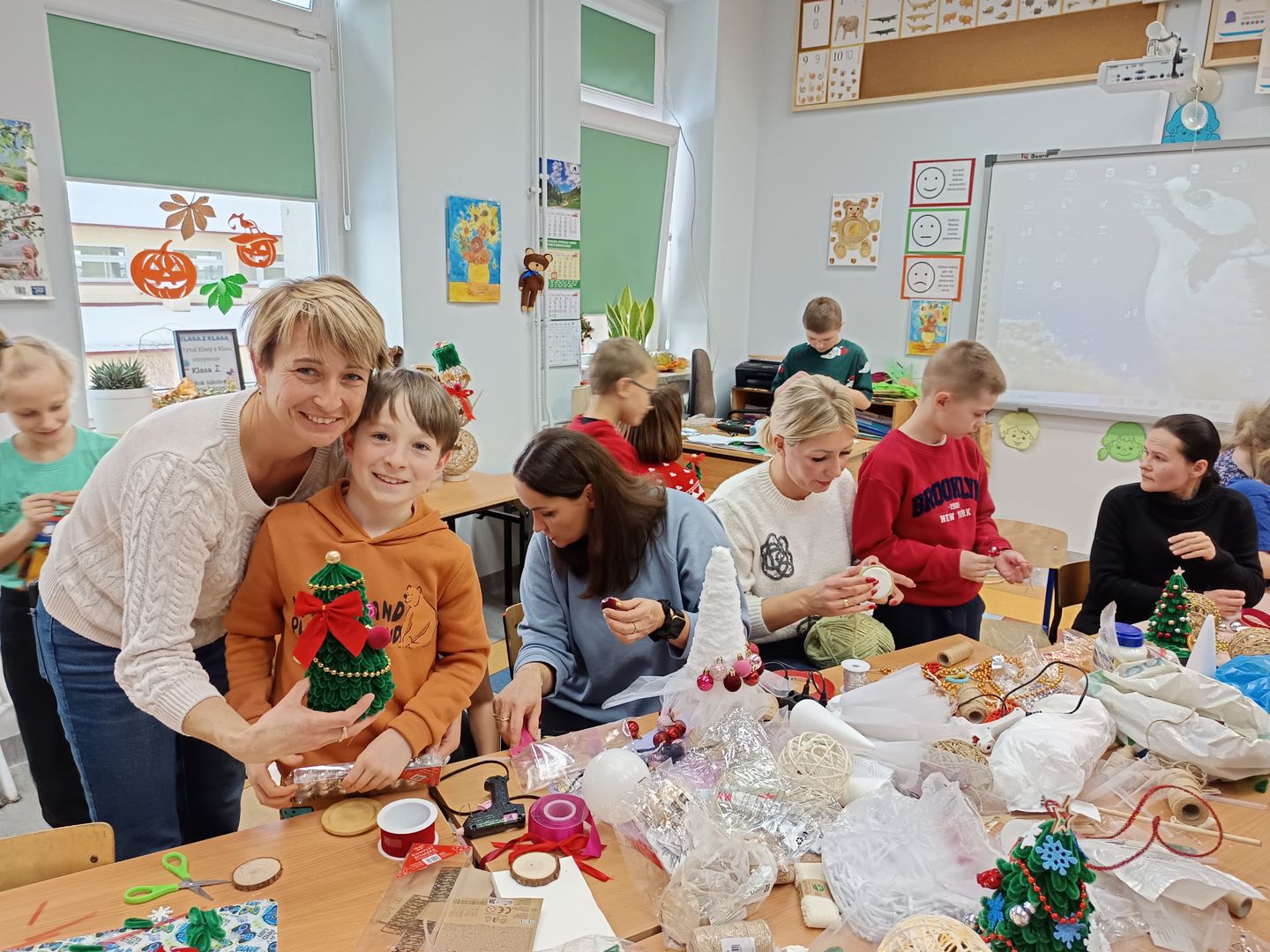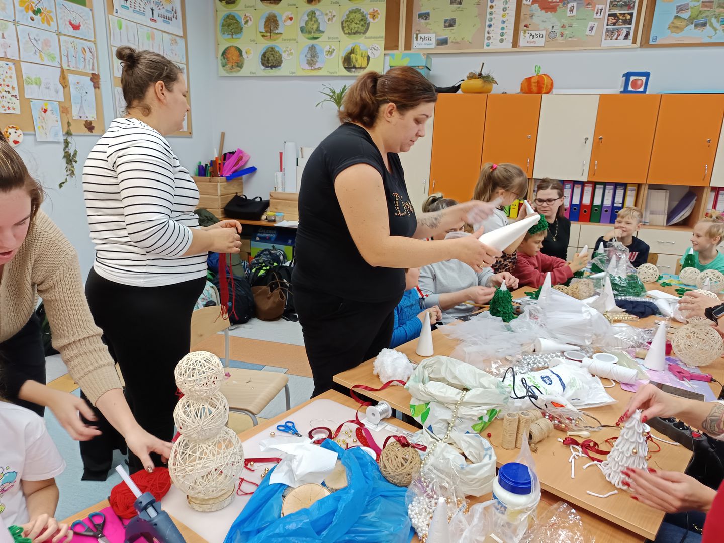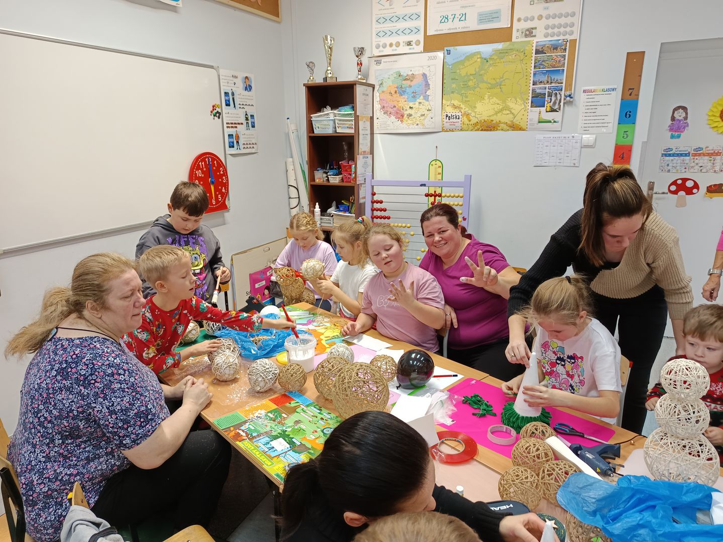 Na spotkanie przybyły mamy ponad połowy uczniów, które wspólnie z dziećmi tworzyły piękne i pomysłowe ozdoby bożonarodzeniowe. Atmosfera była naprawdę wspaniała – dzieci i mamy zaangażowane w pracę, a kreatywność nie miała granic.