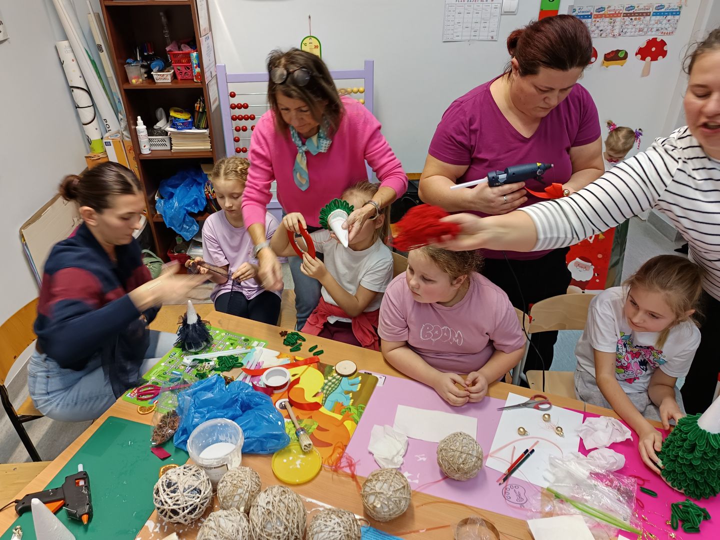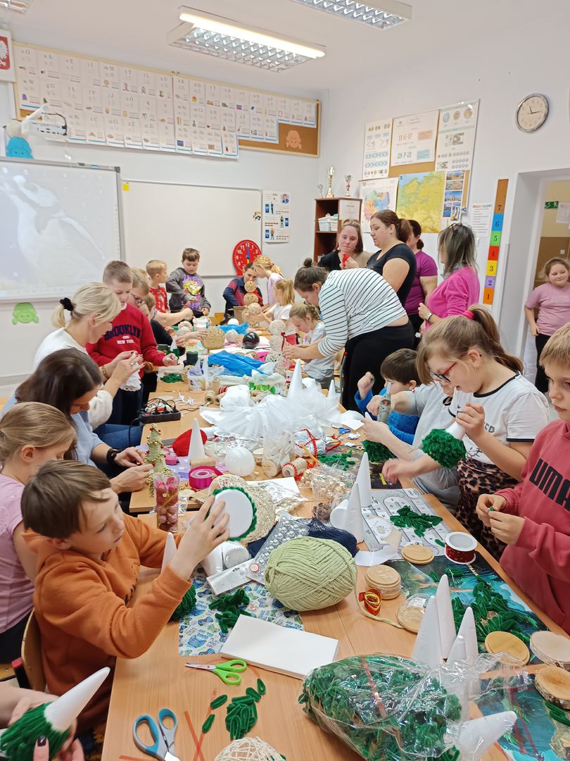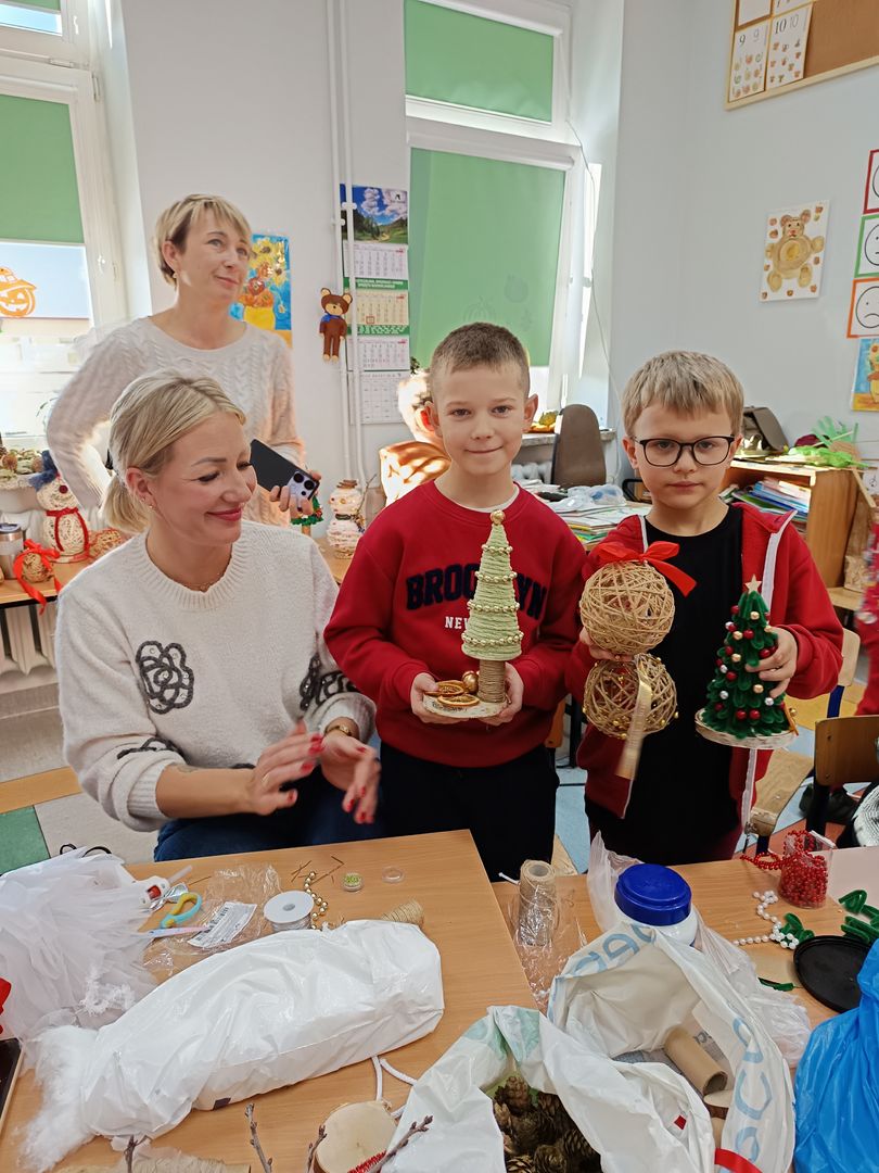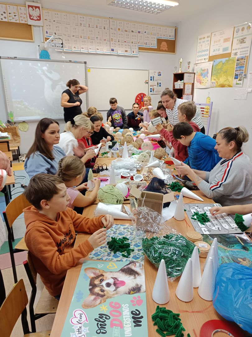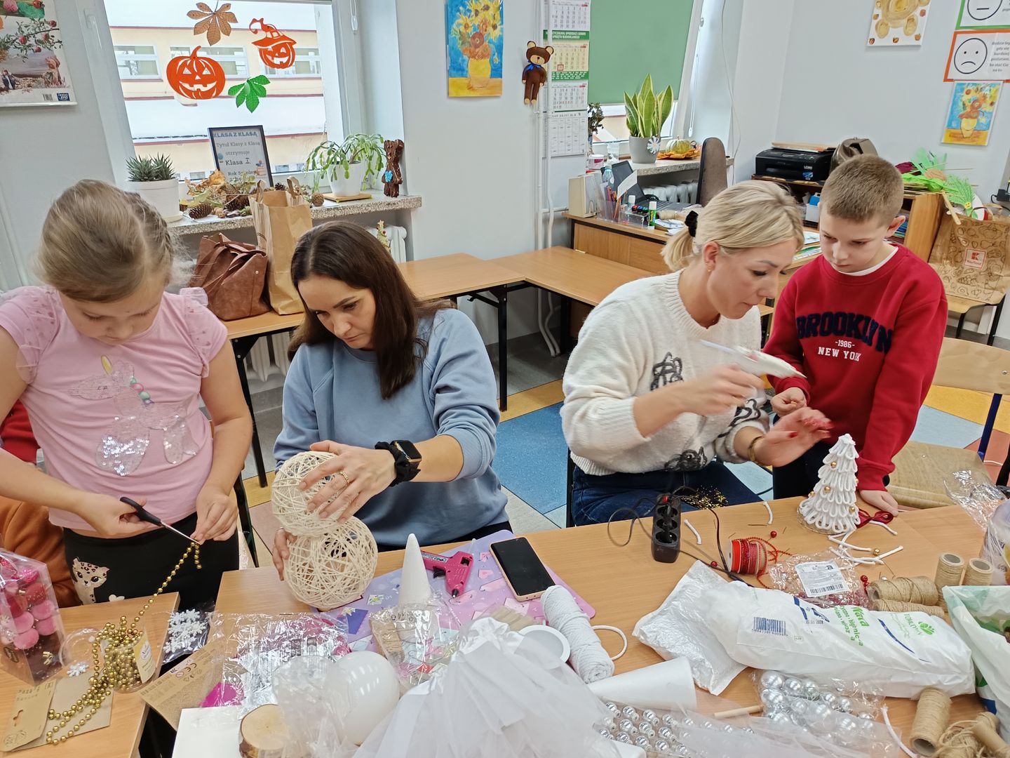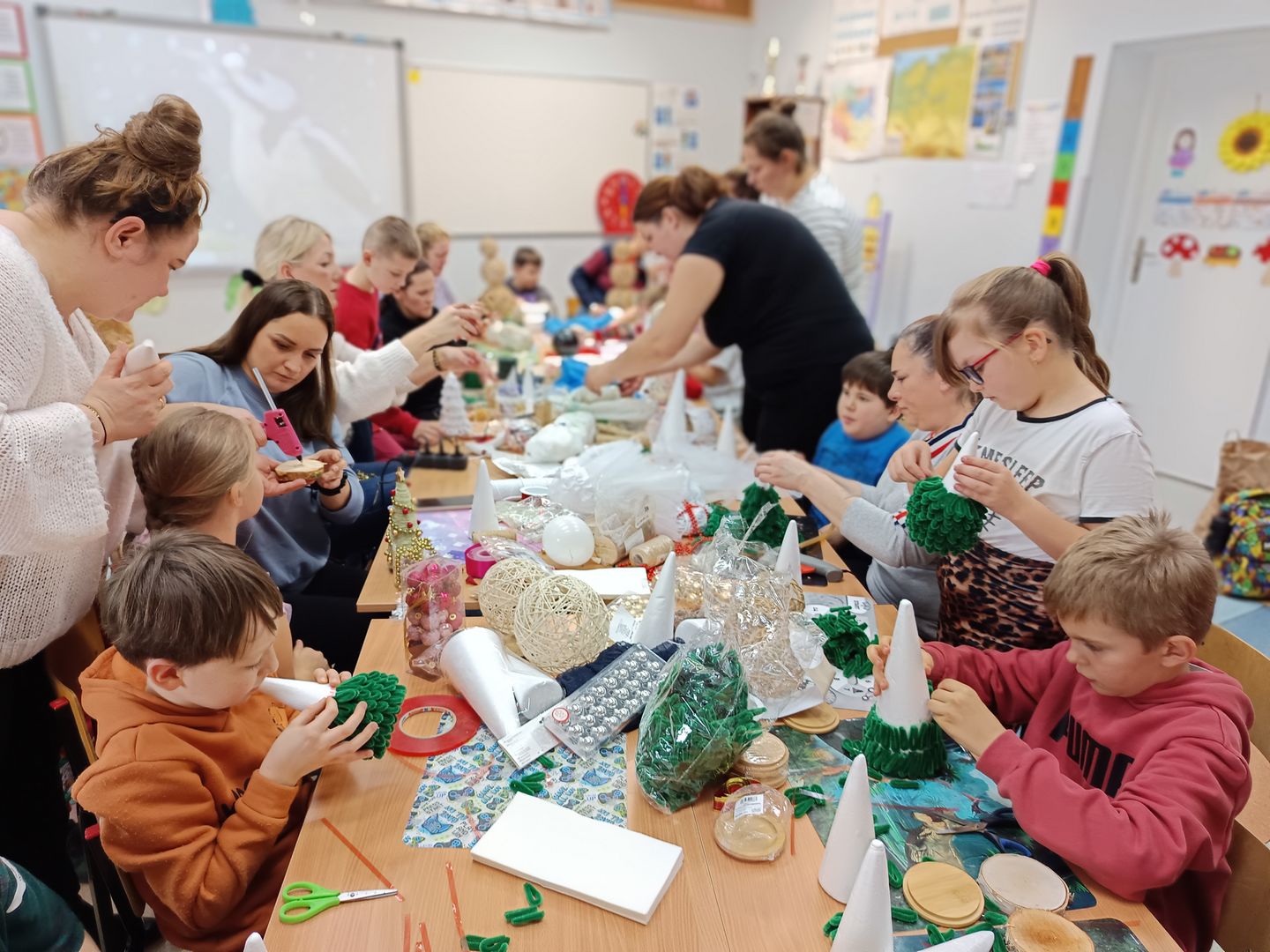 Na spotkanie przybyły mamy ponad połowy uczniów, które wspólnie z dziećmi tworzyły piękne i pomysłowe ozdoby bożonarodzeniowe. Atmosfera była naprawdę wspaniała – dzieci i mamy zaangażowane w pracę, a kreatywność nie miała granic.