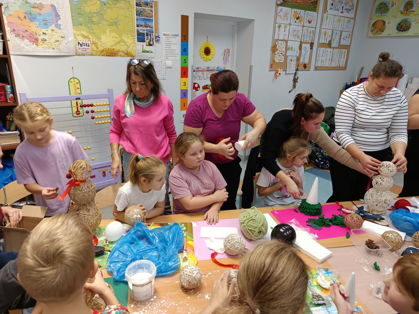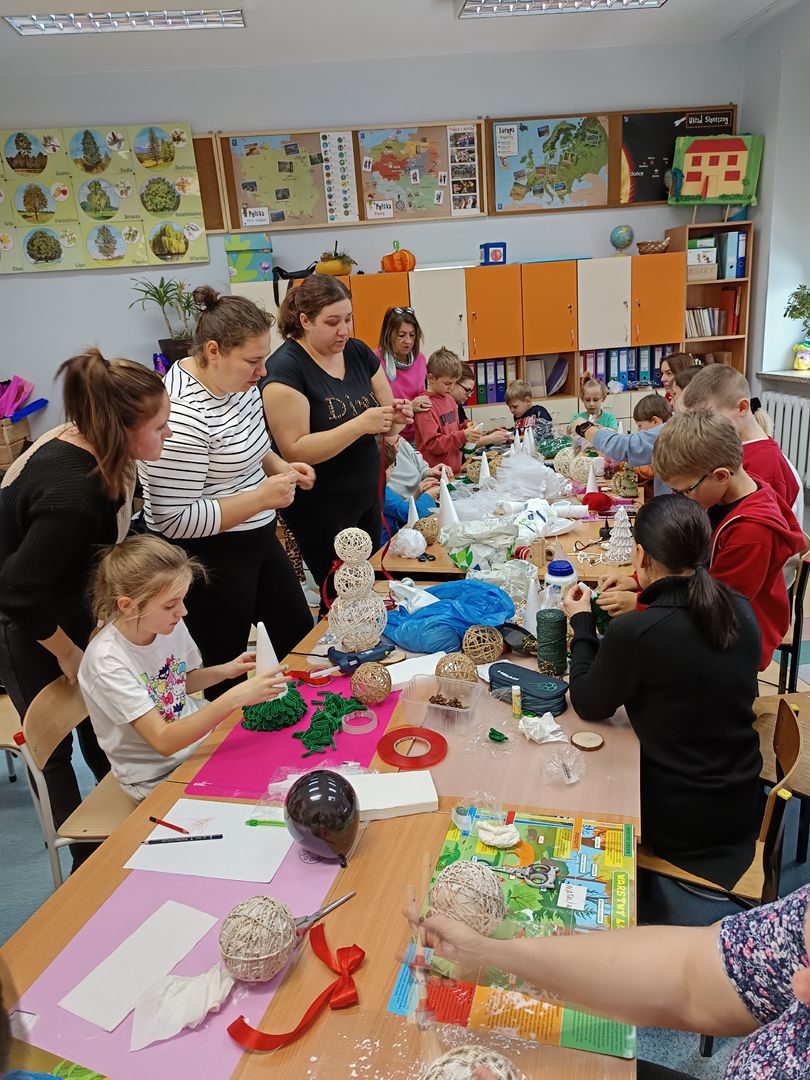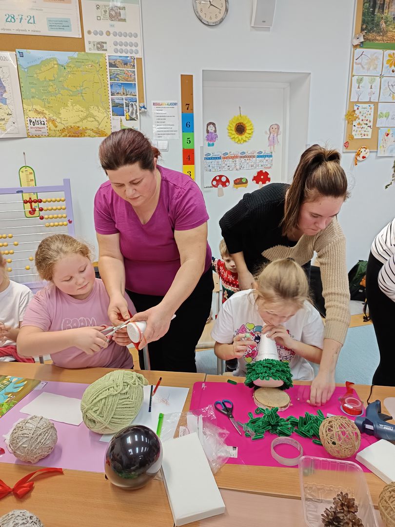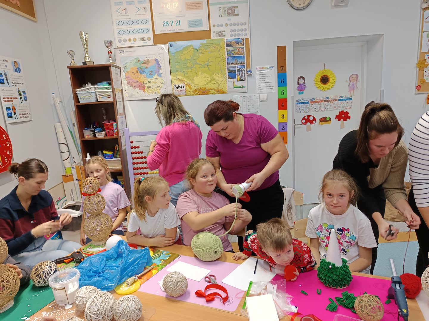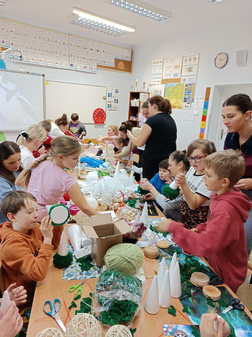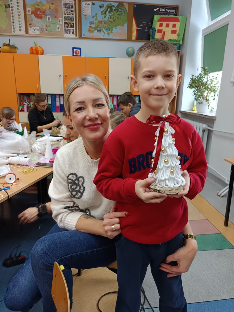 Na spotkanie przybyły mamy ponad połowy uczniów, które wspólnie z dziećmi tworzyły piękne i pomysłowe ozdoby bożonarodzeniowe. Atmosfera była naprawdę wspaniała – dzieci i mamy zaangażowane w pracę, a kreatywność nie miała granic.