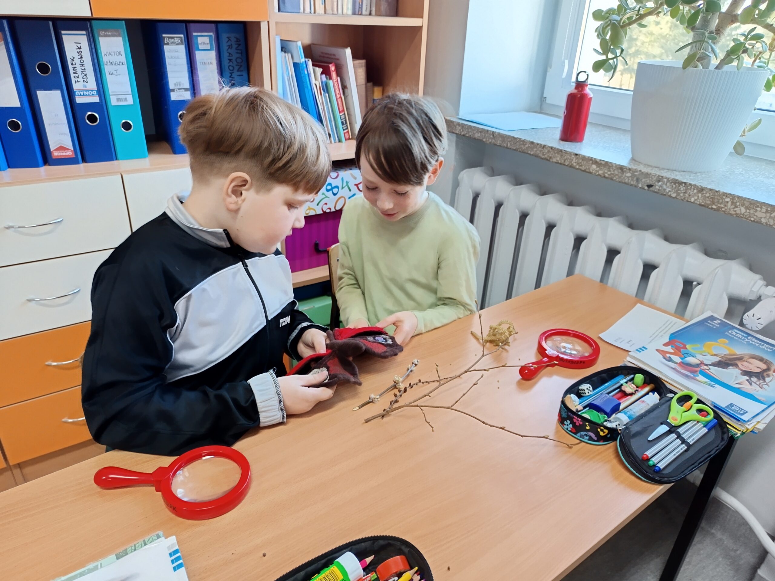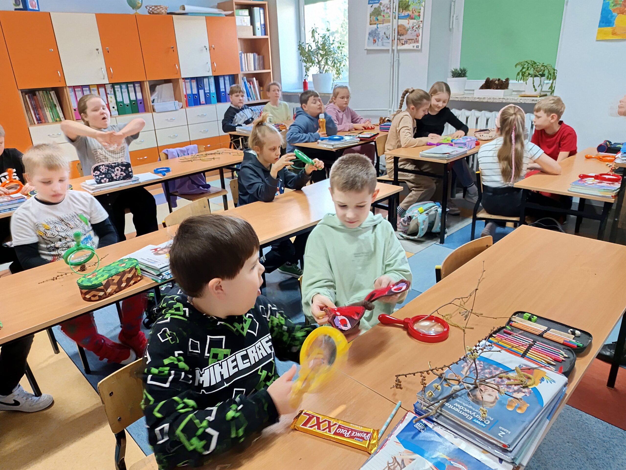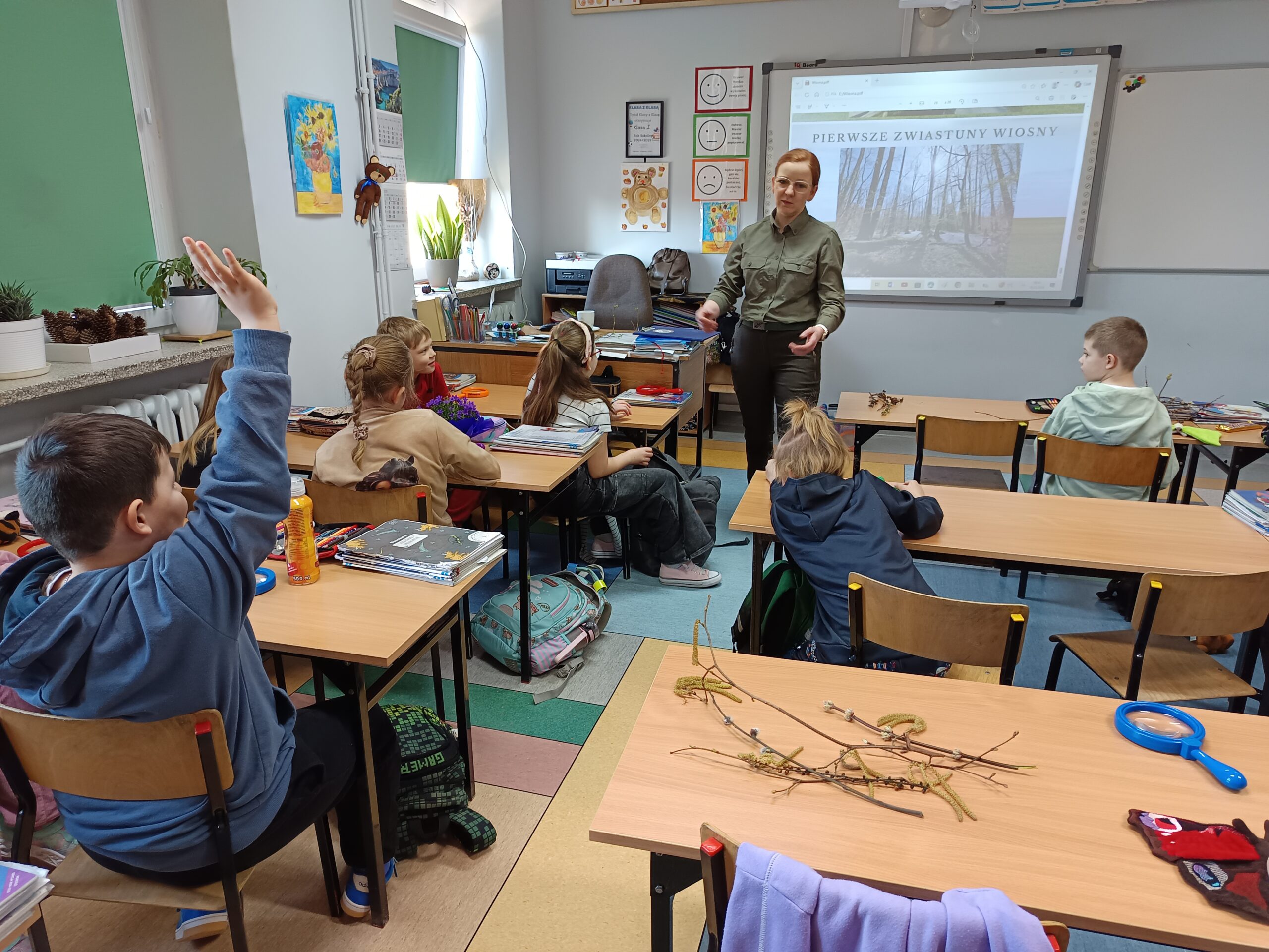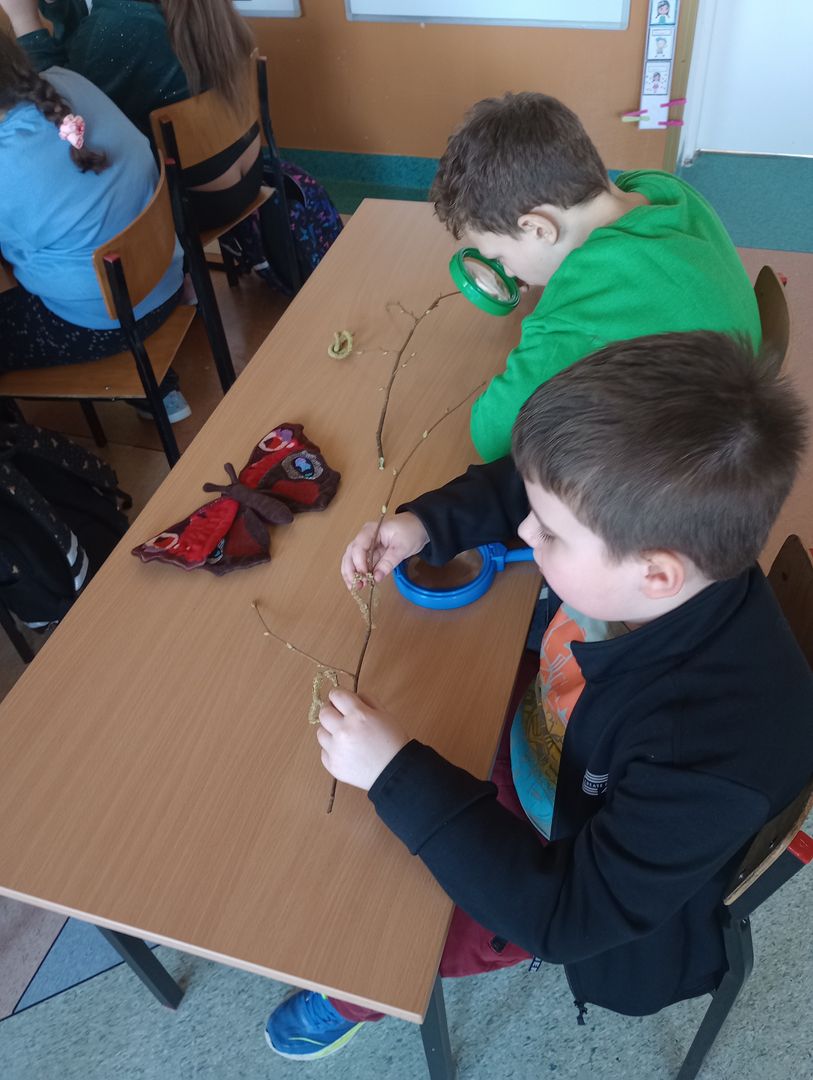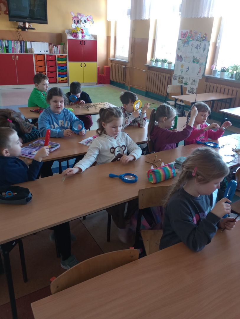 Podczas spotkania z uczniami klas I – III wspólnie odkrywaliśmy tajemnice „wiosennego przebudzenia przyrody”. Dzieci miały okazję prowadzić obserwacje z wykorzystaniem lup, dzięki którym mogły z bliska przyjrzeć się naturalnym okazom – m.in. gałązkom wierzby i leszczyny. Z zainteresowaniem oglądały młode pąki liściowe i kwiatowe oraz poznawały strukturę kory drzew.