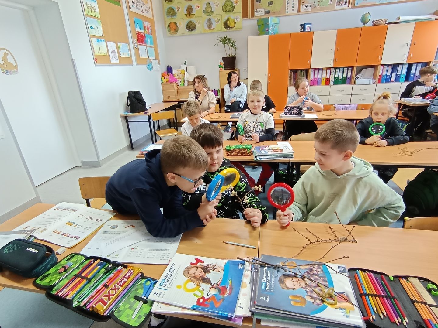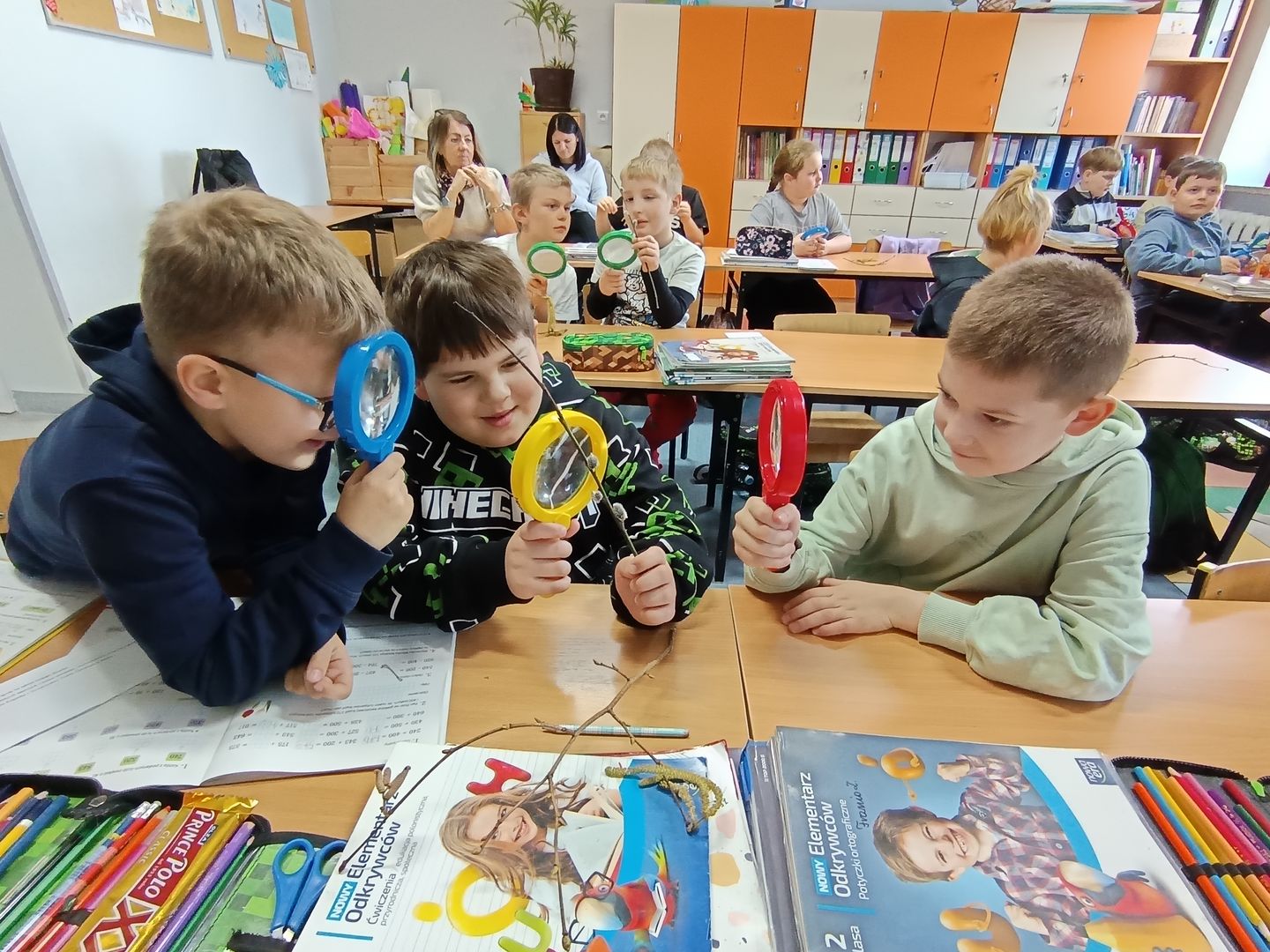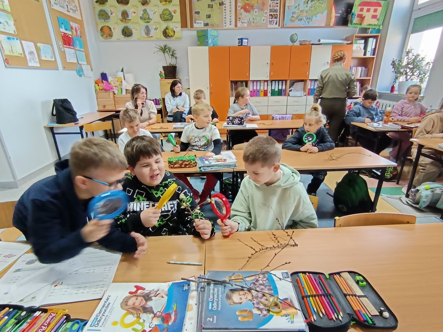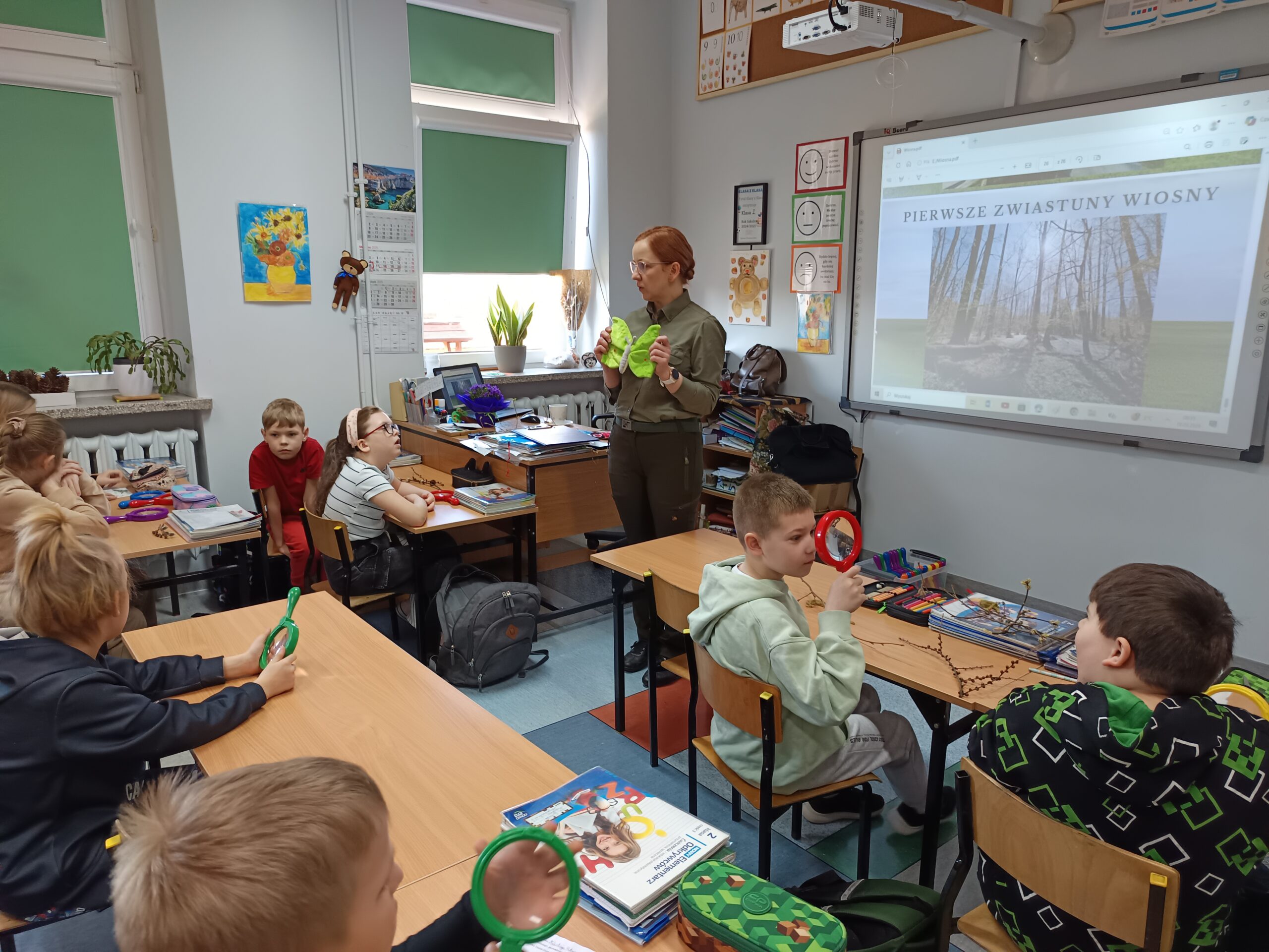 Podczas spotkania z uczniami klas I – III wspólnie odkrywaliśmy tajemnice „wiosennego przebudzenia przyrody”. Dzieci miały okazję prowadzić obserwacje z wykorzystaniem lup, dzięki którym mogły z bliska przyjrzeć się naturalnym okazom – m.in. gałązkom wierzby i leszczyny. Z zainteresowaniem oglądały młode pąki liściowe i kwiatowe oraz poznawały strukturę kory drzew.