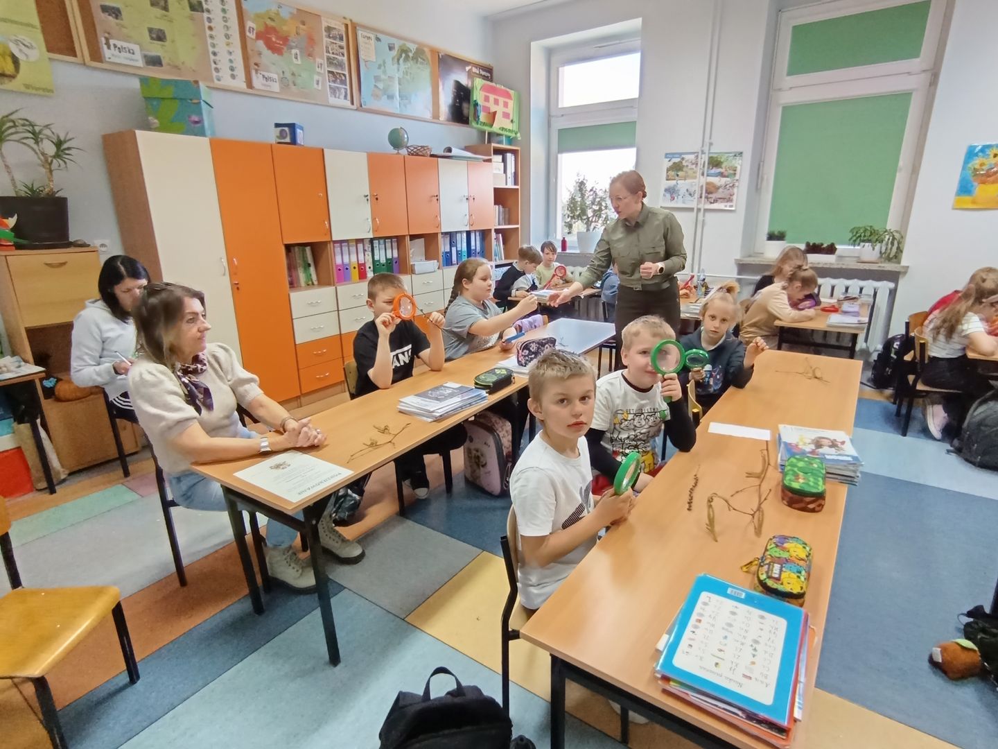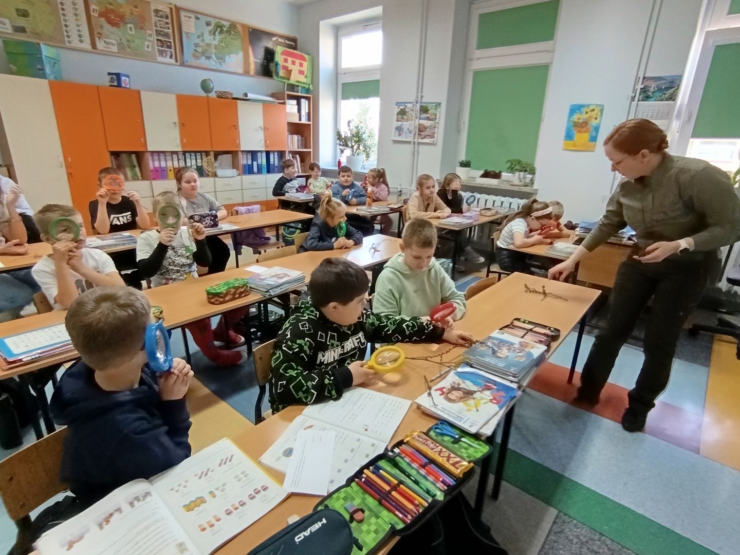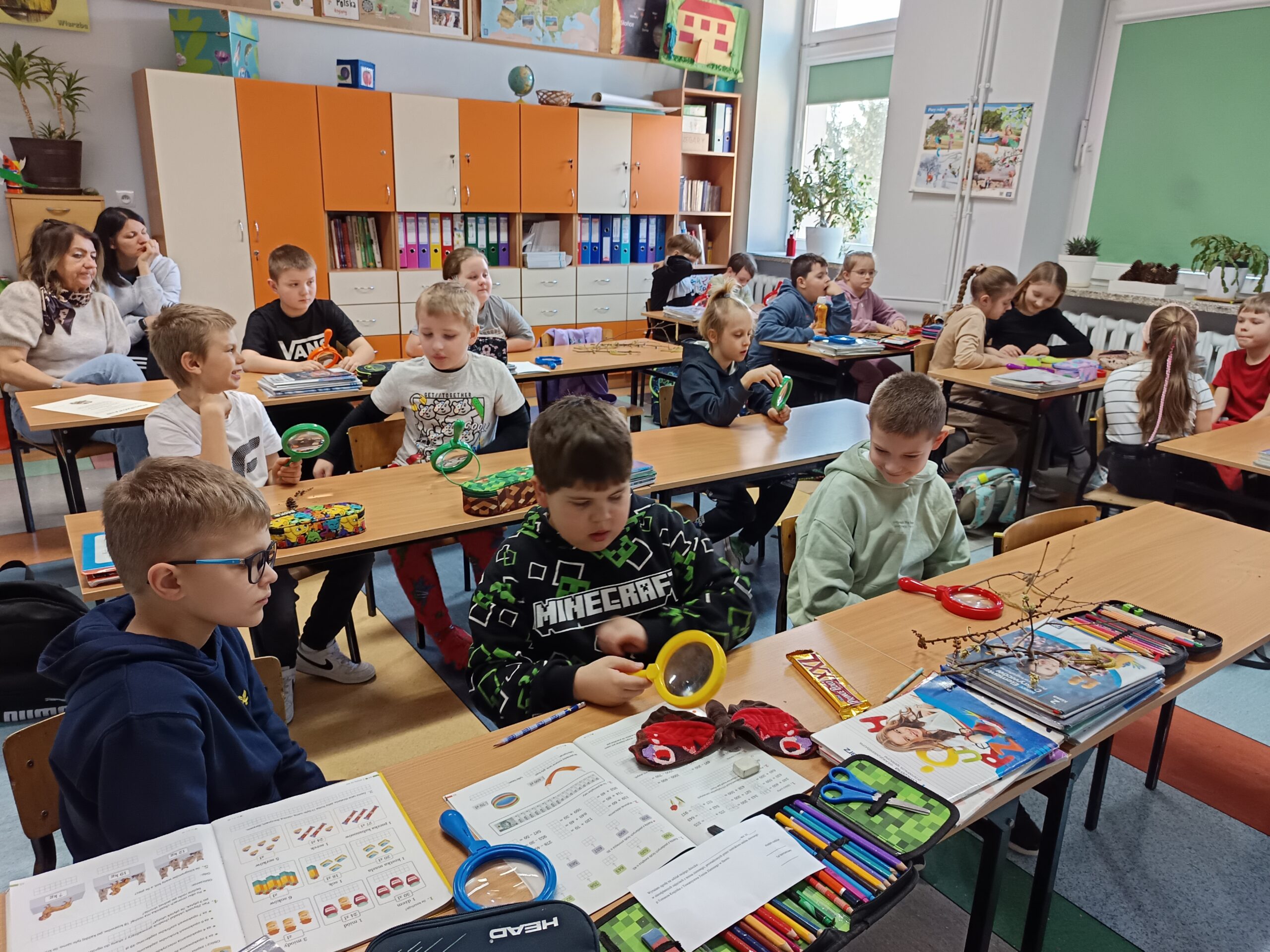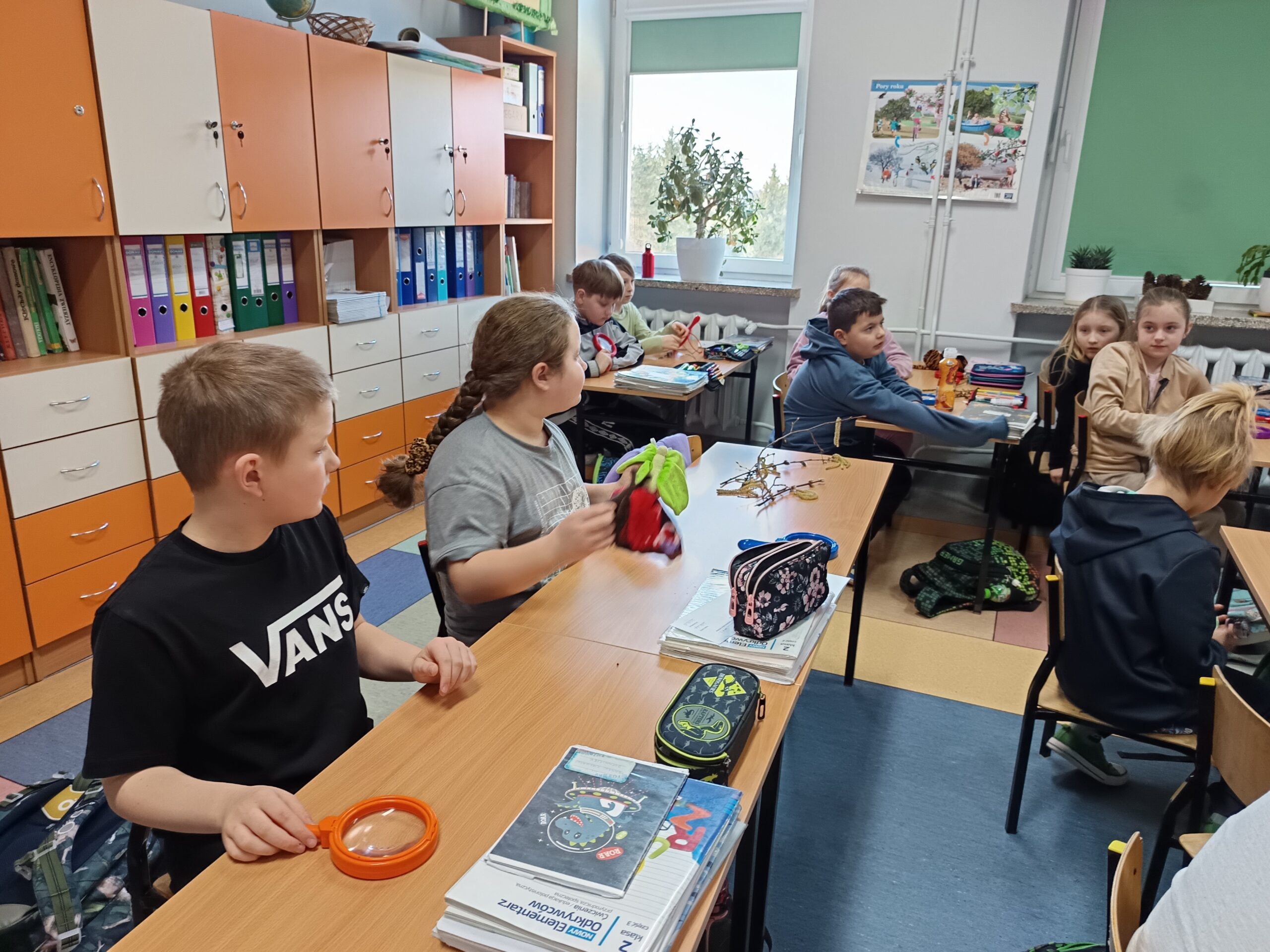 Podczas spotkania z uczniami klas I – III wspólnie odkrywaliśmy tajemnice „wiosennego przebudzenia przyrody”. Dzieci miały okazję prowadzić obserwacje z wykorzystaniem lup, dzięki którym mogły z bliska przyjrzeć się naturalnym okazom – m.in. gałązkom wierzby i leszczyny. Z zainteresowaniem oglądały młode pąki liściowe i kwiatowe oraz poznawały strukturę kory drzew.