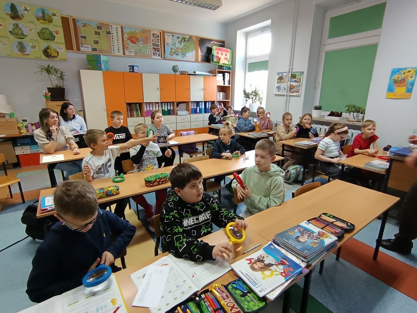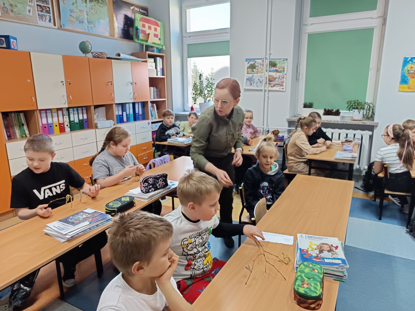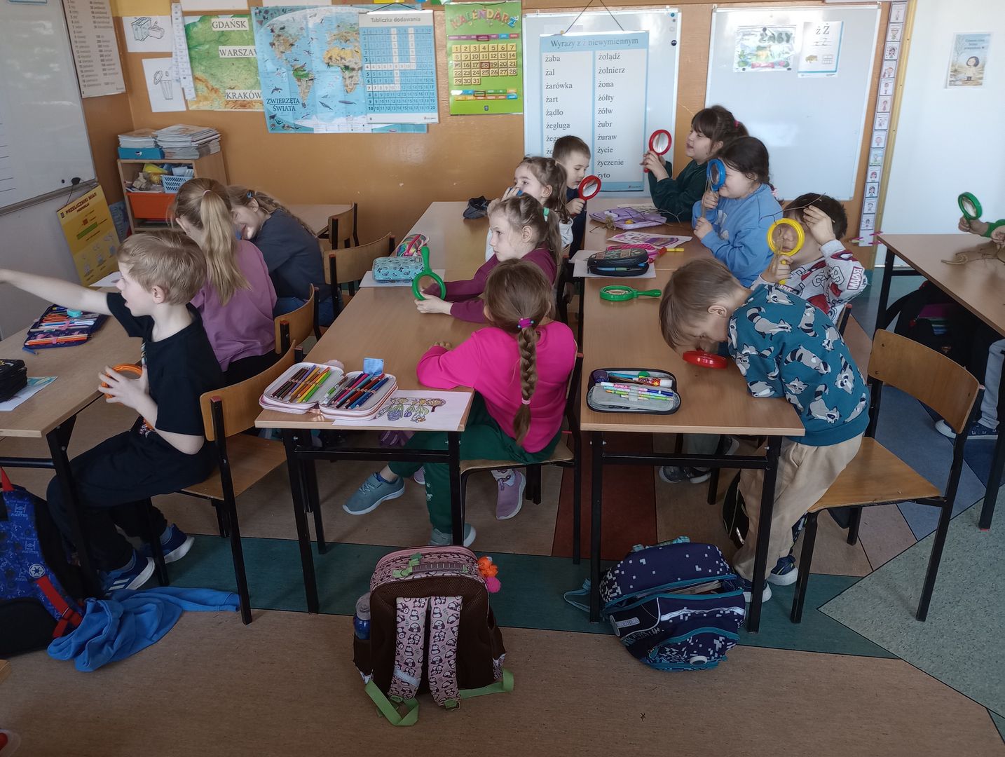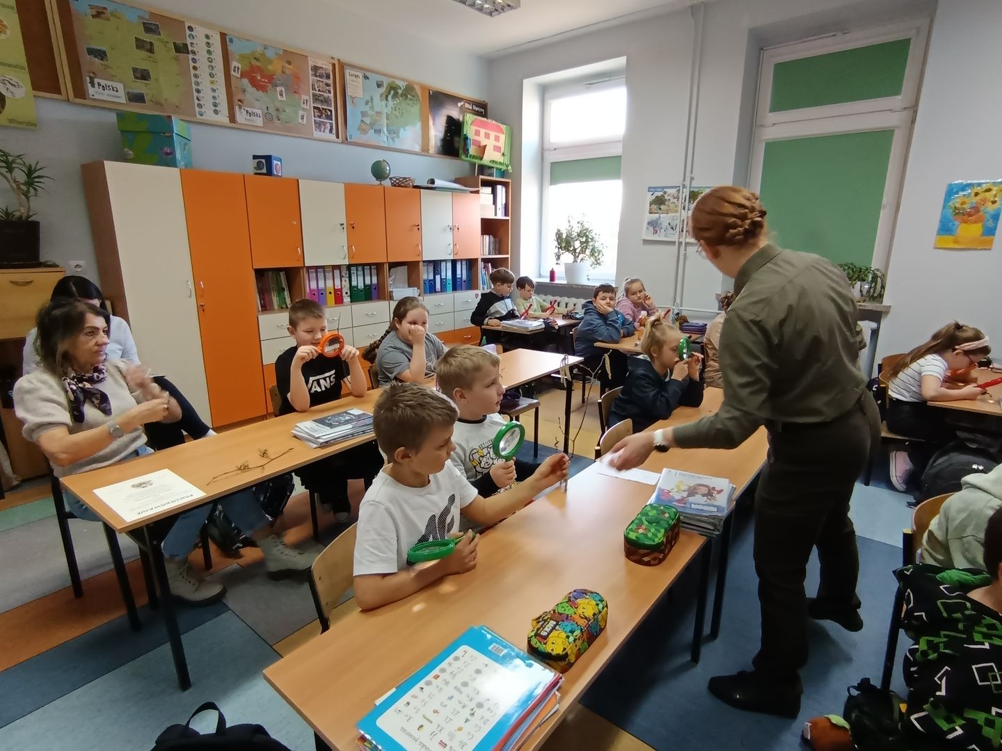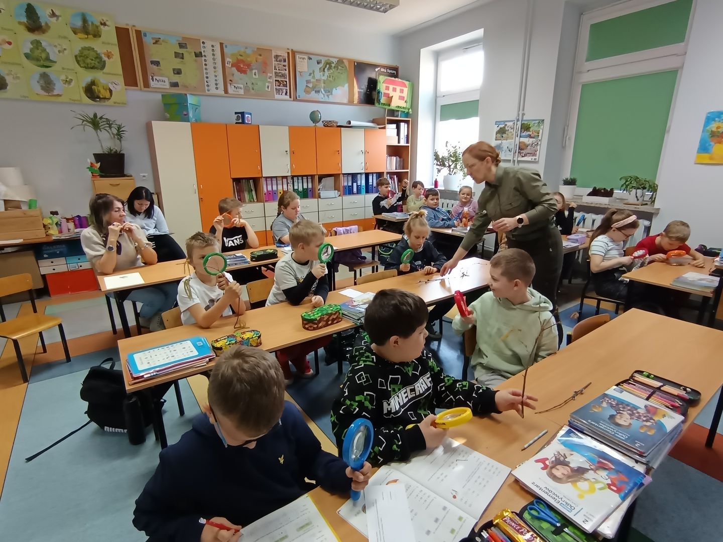 Podczas spotkania z uczniami klas I – III wspólnie odkrywaliśmy tajemnice „wiosennego przebudzenia przyrody”. Dzieci miały okazję prowadzić obserwacje z wykorzystaniem lup, dzięki którym mogły z bliska przyjrzeć się naturalnym okazom – m.in. gałązkom wierzby i leszczyny. Z zainteresowaniem oglądały młode pąki liściowe i kwiatowe oraz poznawały strukturę kory drzew.