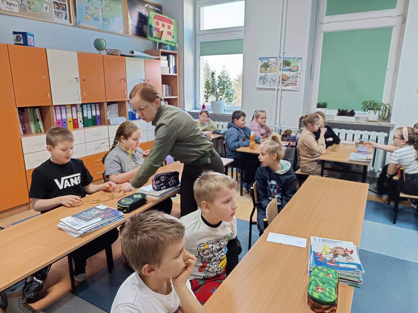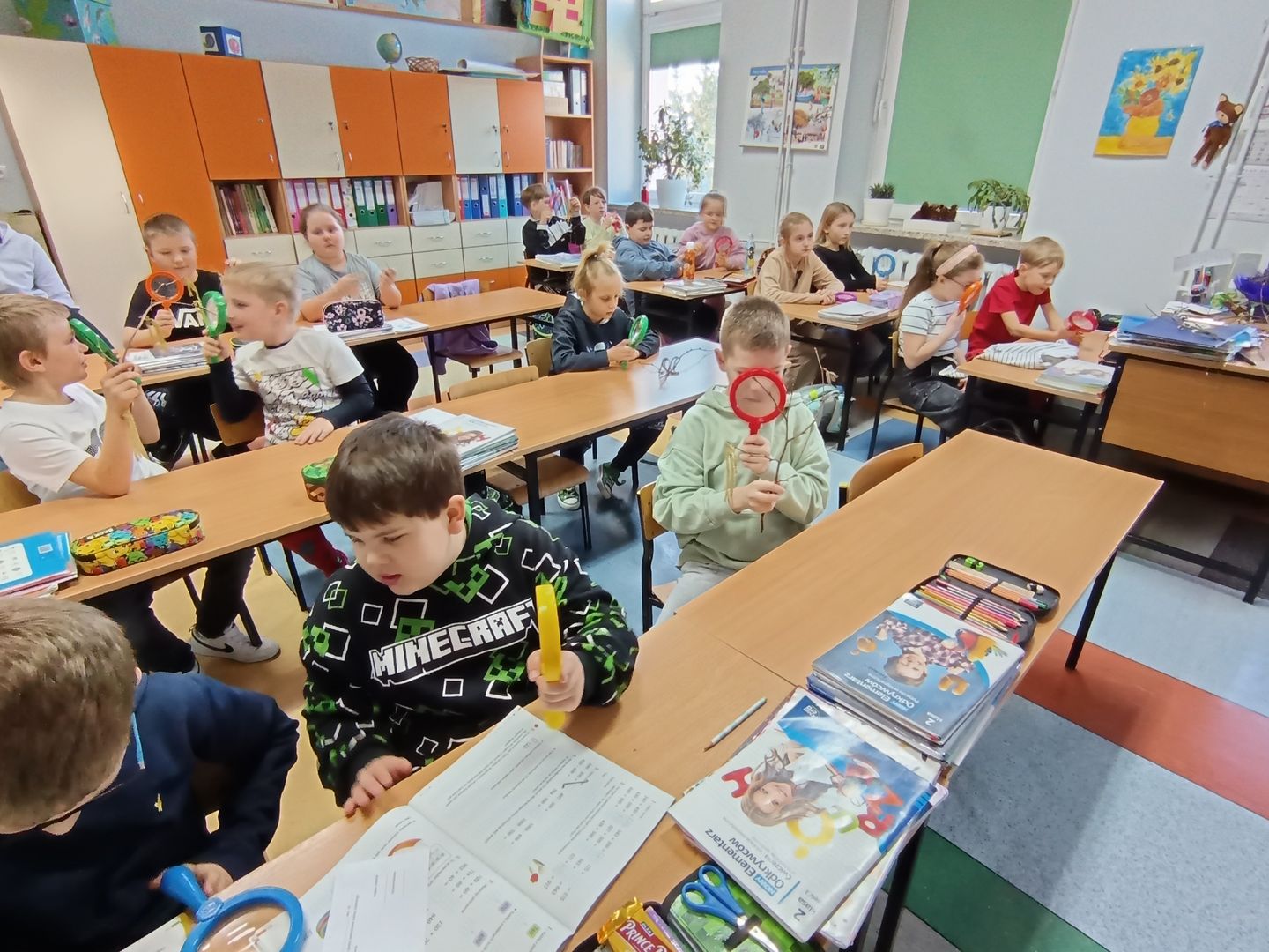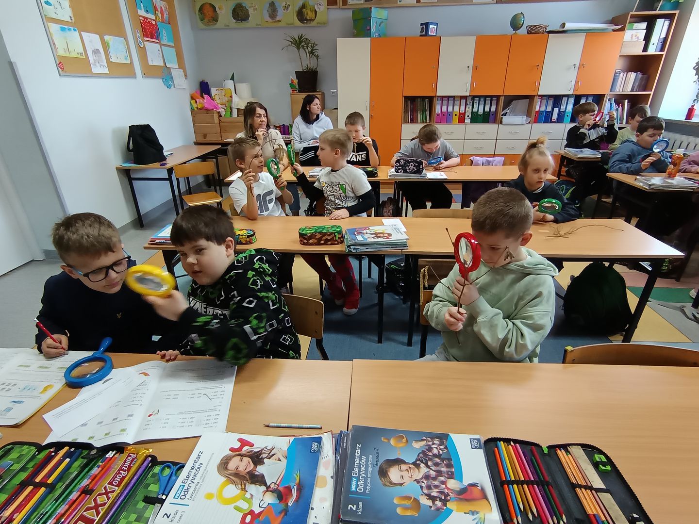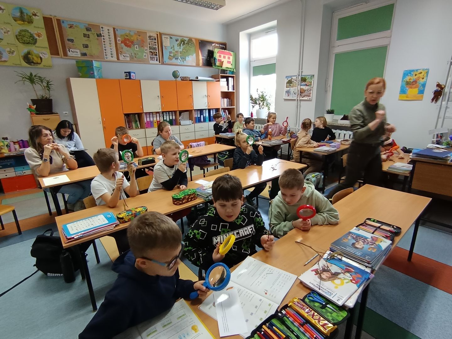 Podczas spotkania z uczniami klas I – III wspólnie odkrywaliśmy tajemnice „wiosennego przebudzenia przyrody”. Dzieci miały okazję prowadzić obserwacje z wykorzystaniem lup, dzięki którym mogły z bliska przyjrzeć się naturalnym okazom – m.in. gałązkom wierzby i leszczyny. Z zainteresowaniem oglądały młode pąki liściowe i kwiatowe oraz poznawały strukturę kory drzew.